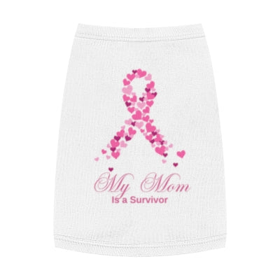 Show your support for Breast Cancer Awareness Month with this adorable dog shirt. Featuring a pink ribbon made up of delicate pink hearts and the proud message "My Mom is a Survivor," this shirt is perfect for honoring the strong women who have fought and won their battle against breast cancer. Made from soft, breathable fabric, it ensures your furry friend stays comfortable while spreading a meaningful message. Whether at home or out for a walk, your dog will be helping to raise awareness and celebrate the survivors we love. Available in multiple sizes to fit most breeds!