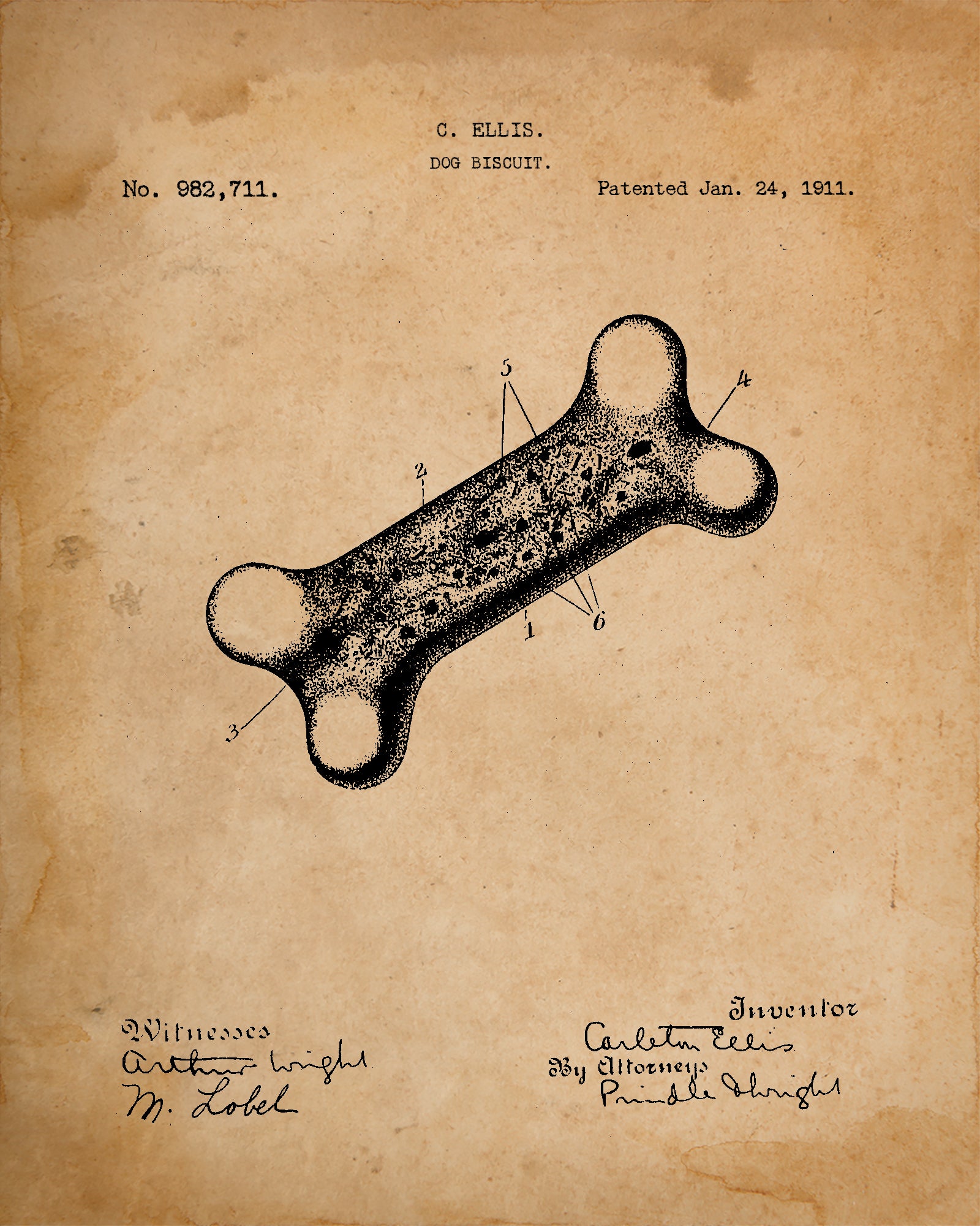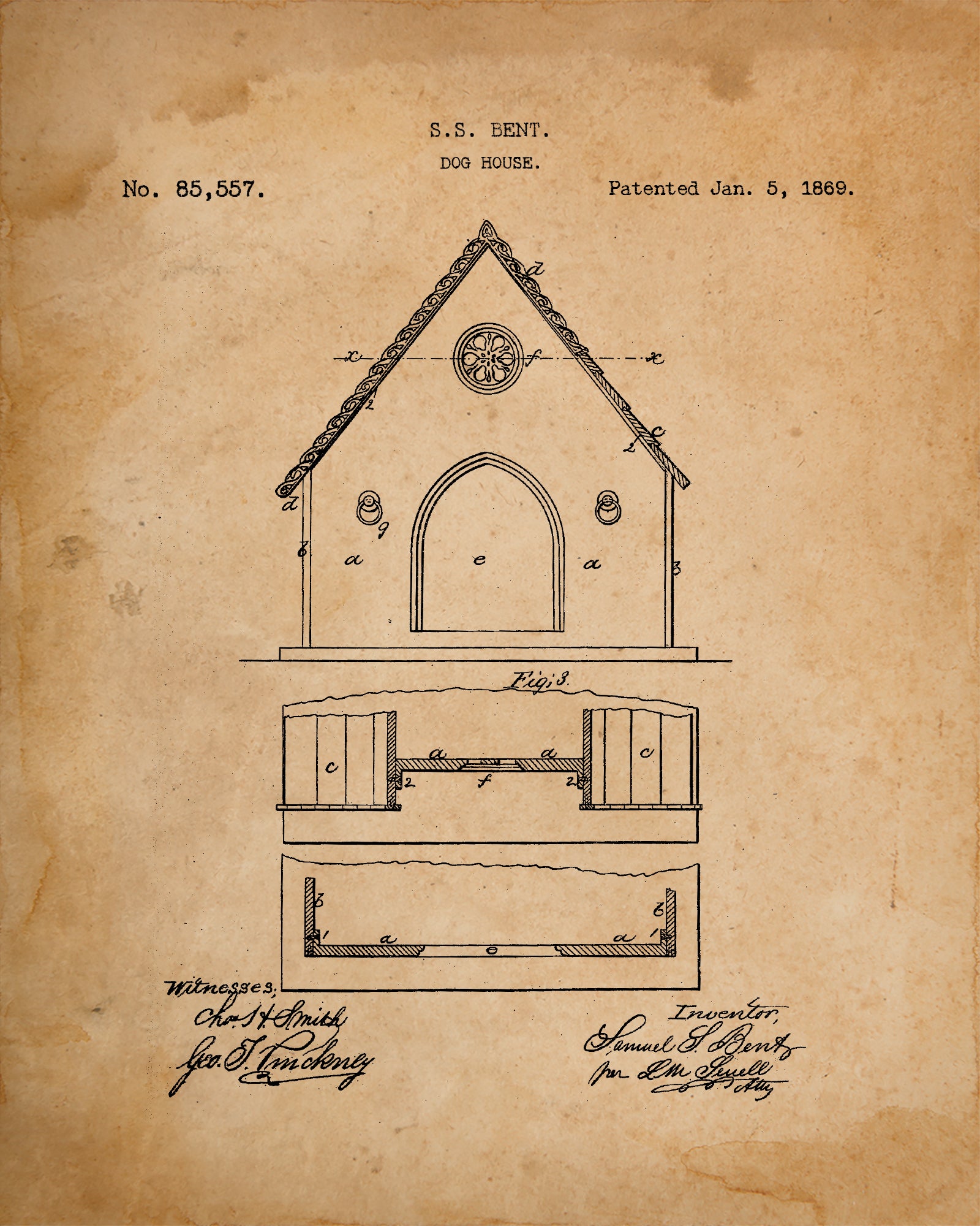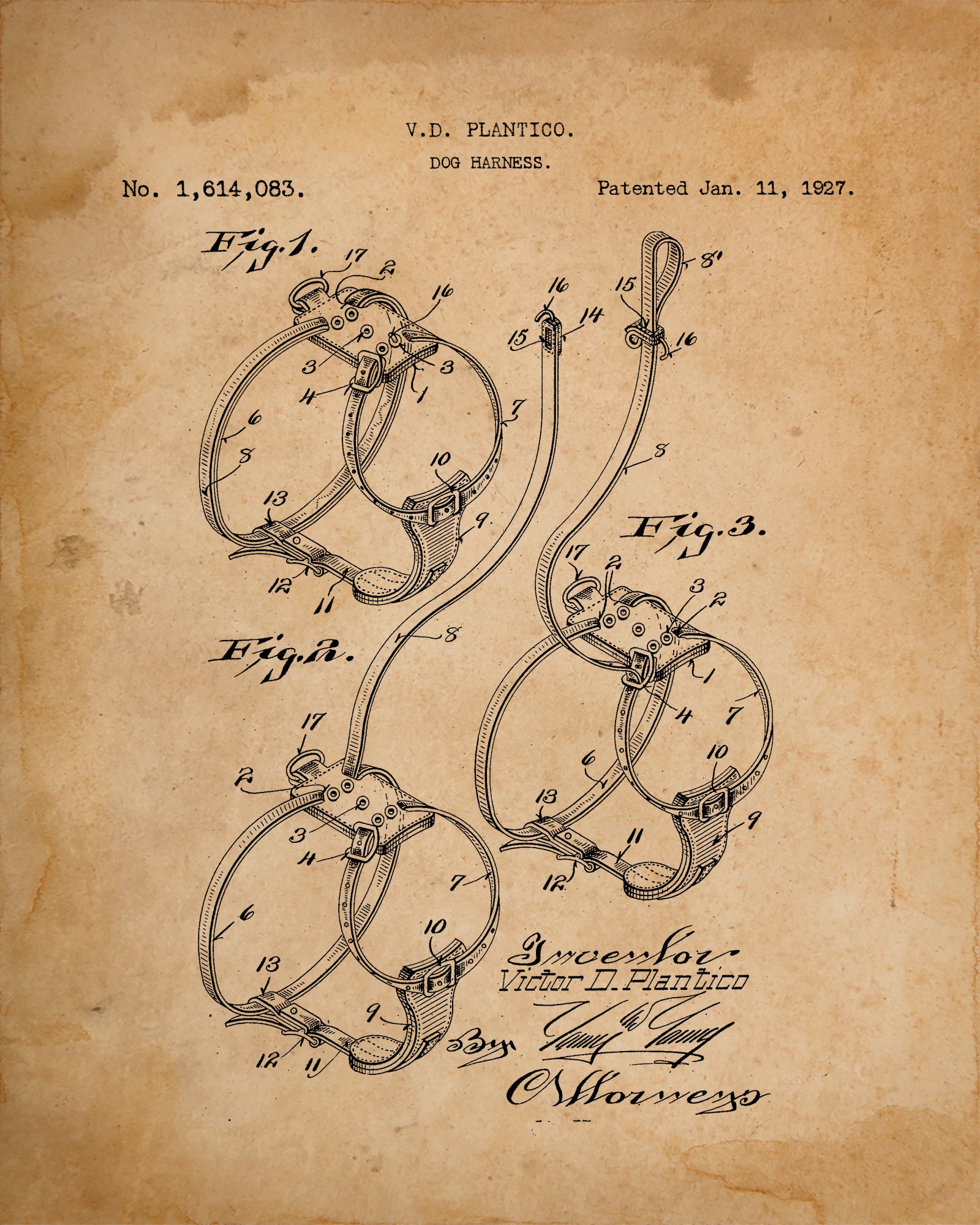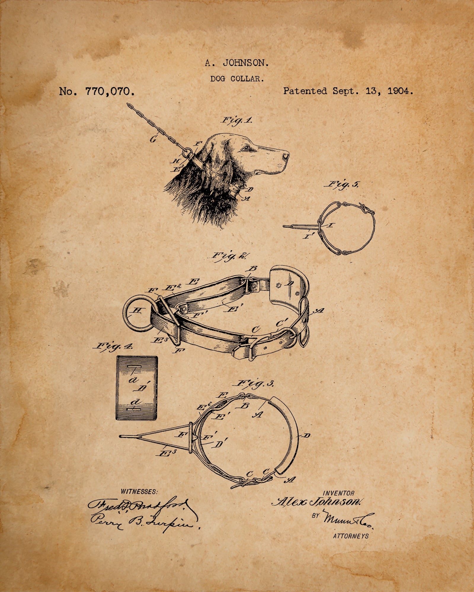 Set of 4 Patent Prints - Dog Collar, Harness, Biscuit & Dog House - 1869 - 1927